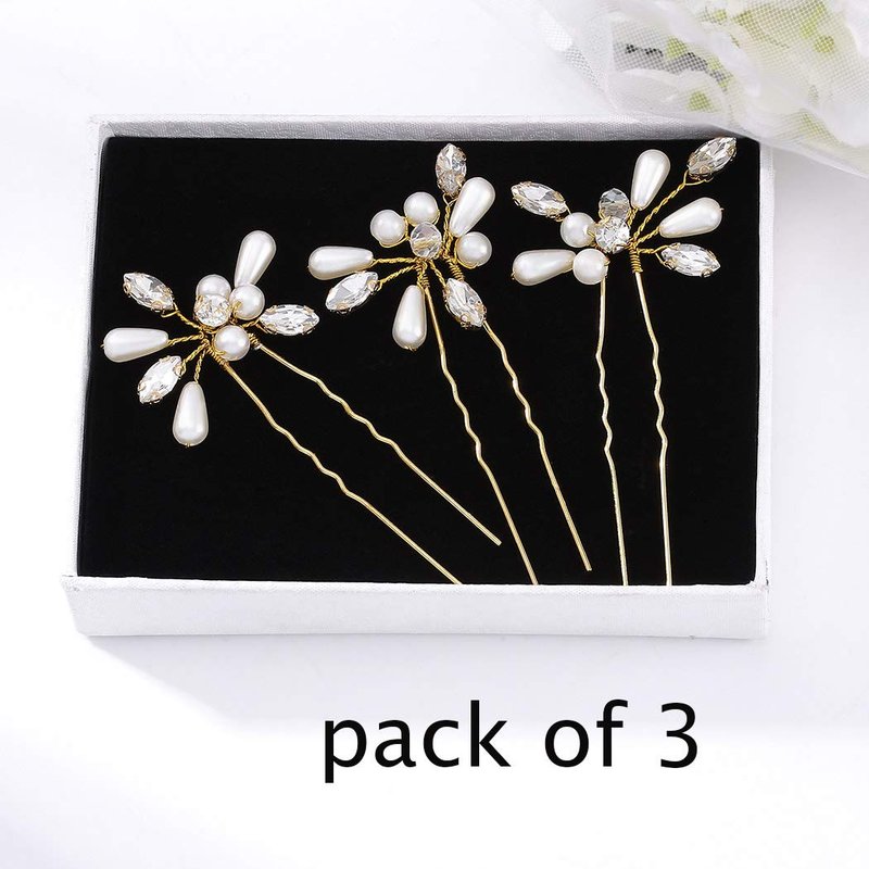 - Bridal hair pins made of alloy wire, flower,paerl and rhinestone; Pack of 3.