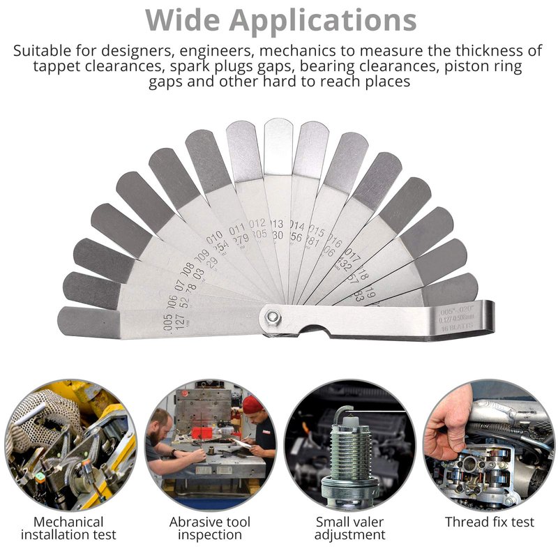 - Scale clear, easy to use,Metal fastening screws, durable,Please don't put on the humid environment.There is some anti-rust oil on the stainless steel feeler gauge to prevent it from rusty.