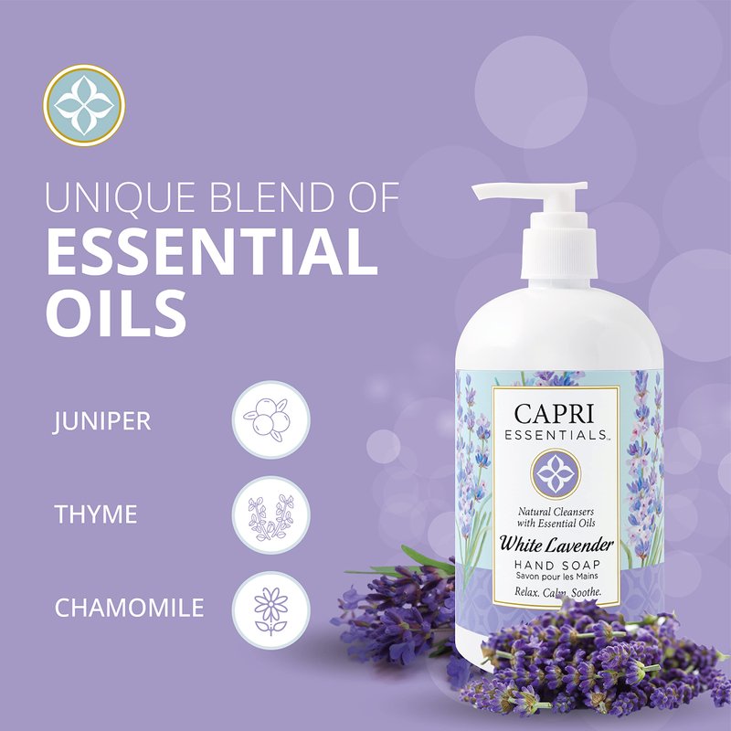 - Unique Blend: Capri’s White Lavender kitchen and bathroom soap uses a special blend of Lavender, Juniper, Thyme, and Chamomile essential oils to create a relaxing atmosphere. Our scented hand soap gives a refreshing and calming flowery, camphor-like scent for your enjoyment.