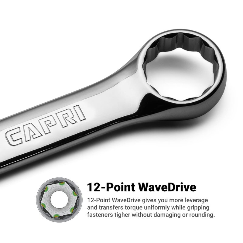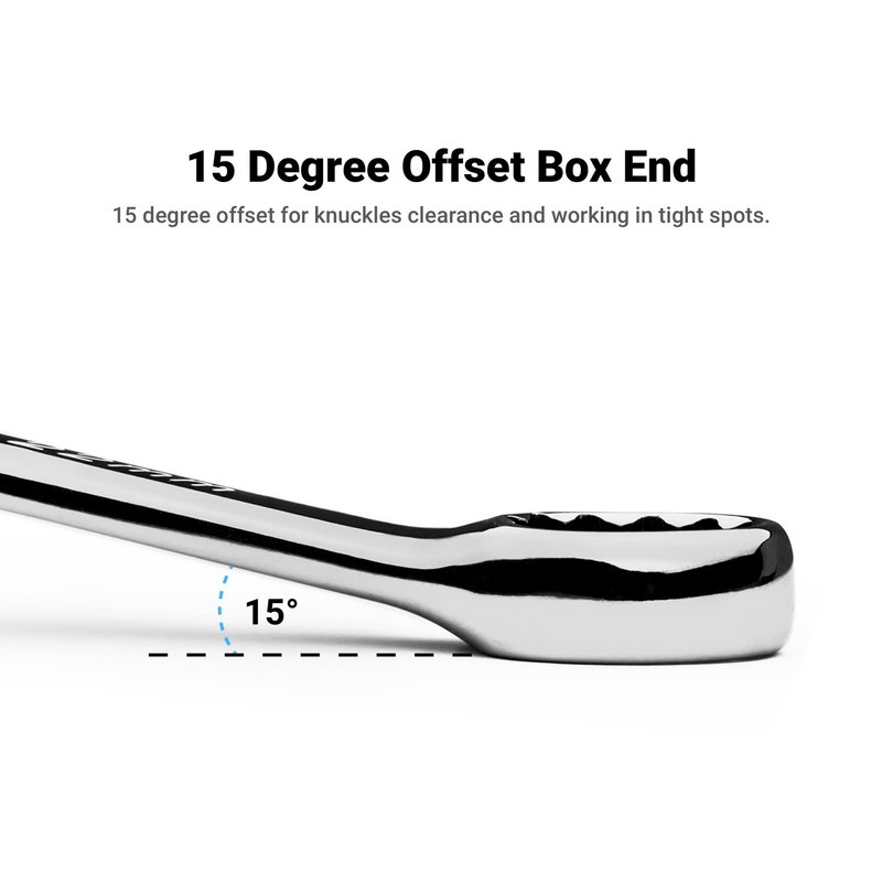 - 12-point WaveDrive box end transfers torque uniformly and prevents damaging and rounding of the bolt, 15-degree offset for knuckle clearance and working in tight spots
