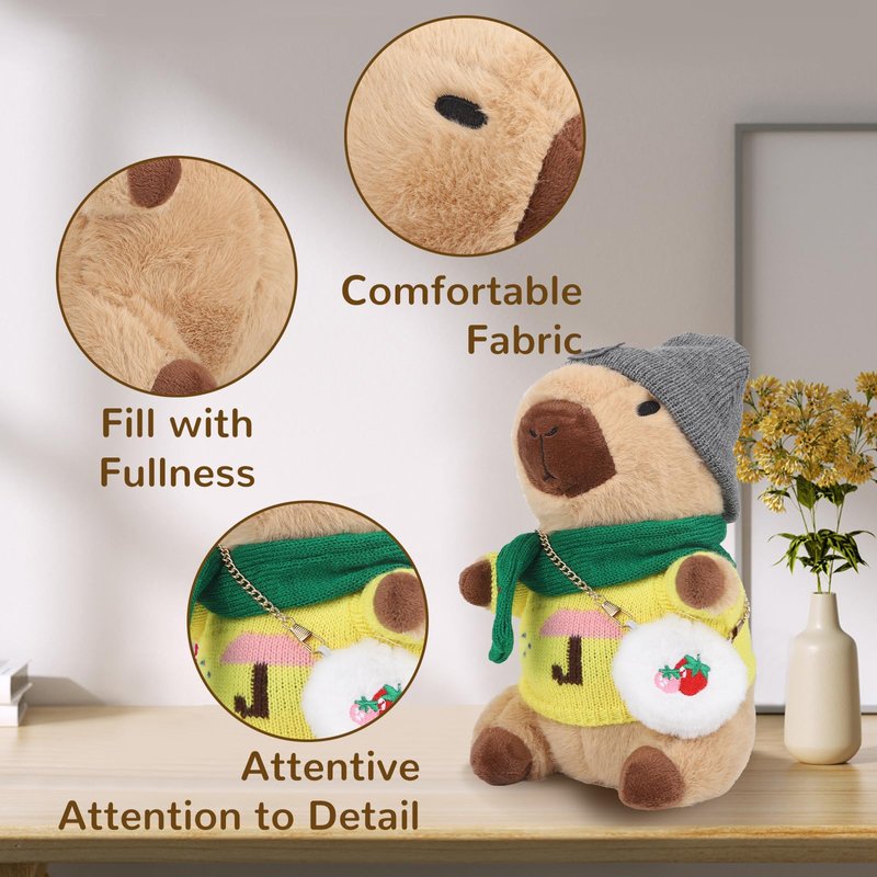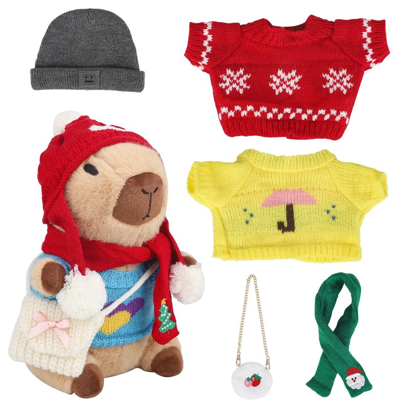 - 【Various styling combinations】Our Christmas stuffed animal comes with 10 pieces of clothes and accessories,Includes 2 hats, 3 sweaters, 2 scarves and 2 bags, Plus 1 teddy bear stuffed animal.Baby first christmas to dress up the stuffed capybara in various clothes to create a unique capybara keychain Christmas toys ,it can exercise hands-on ability and matching ability for kids