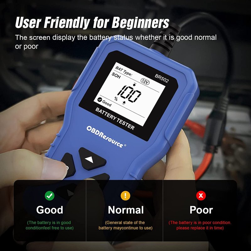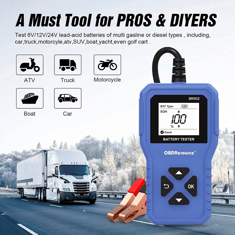 - ✅【Car Battery Tester】 BR502 can test all 6V/12V/24V 100-2000CCA batteries including regular flooded, AGM flat plate, AGM spiral, or gel batteries, compatible with cars, SUVs, Pickups, Boats, Motorcycles and etc. Provide overall analysis of batteries’ health and help you know its status in advance before it dies.