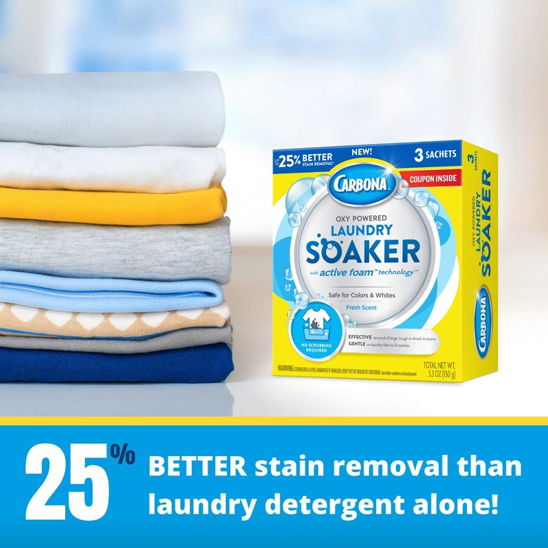 - STAIN FIGHTING FORMULA: Carbona Oxy Powered Laundry Soaker with Active Foam Technology — for life’s biggest stains! The powerful chlorine bleach free formula lifts stains and restores your clothing without the need for scrubbing.