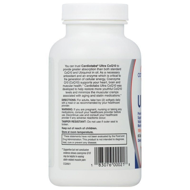 - HIGH ABSORPTION: Cardiotabs Ultra CoQ10 is based in safflower oil and uses particular surfactants to help disperse the softgel contents for maximum absorption. Most powder-based CoQ10 has low absorption (<1%), while Cardiotabs Ultra CoQ10 has a 6% absorption rate. Cardiotabs Ultra CoQ10 comes in softgel form, 2 a day for a 60 day supply.