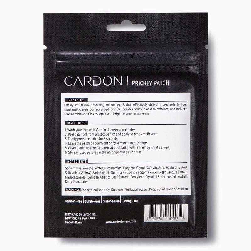Cardon brings the newest Korean skincare to men's daily routines using high quality, high-performing formulas and innovative technology. Our latest acne treatment for the face, the Prickly Pimple Patch, uses tiny dissolving microdarts to penetrate beneath the skin's surface delivering potent healing directly to the area of concern. Our 1-step zit stickers strongly adhere to the face to protect against popping and infection and heals pimples with 2% salicylic acid, niacinamide and hyaluronic acid. This multi-use acne patch helps relieve ingrown hairs and razor bumps, too! Our pimple patches are powerful acne tools that come in a pack of 9 convenient and compact enough to toss in your carry-on. Consider them your new airplane travel essentials. Paraben-free, sulfate-free, silicone-free and cruelty-free. HOW TO USE: 1. Wash your face with Cardon face cleanser and pat dry. 2. Peel patch off from protective film and apply to problematic area. 3. Firmly press the patch for 5 seconds. 4. Leave the patch on overnight or for a minimum of 2 hours. 5. Cleanse affected area and repeat application with a fresh patch, if desired. 6. Store unused patches in the accompanying clear case. FULL INGREDIENTS: Sodium Hyaluronate, Water, Niacinamide, Butylene Glycol, Salicylic Acid, Hyaluronic Acid, Sa lix Alba (Willow) Bark Extract, Opuntia Ficus-Indica Stem (Prickly Pear Cactus) Extract, Madecassoside, Centella Asiatica Leaf Extract, Pentylene Glycol, 1,2-Hexanediol, Sodium Dehydroacetate