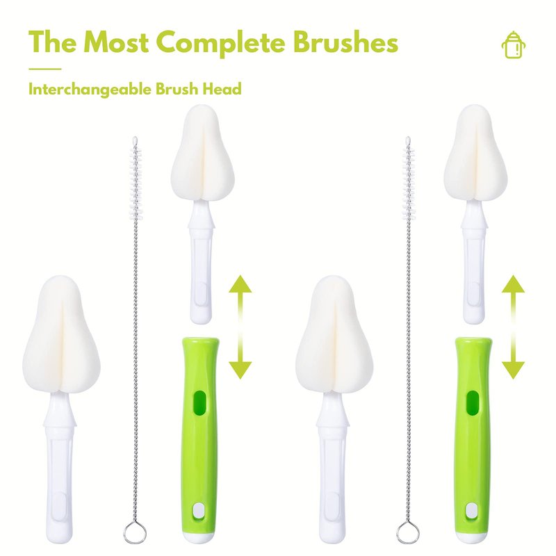1. 【Perfect Baby Bottle Brushes Set - 3 Nipple Brushes with 3 interchangeable brushes head, 2 Long Straw Brushes】 2. 【Perfect Size - 6.5" sponge nipple brush, fit perfectly for cleaning baby bottle nipple and breast pump small parts. 6.7" straw brush, great for cleaning bottle straw, sippy cup straw etc.】 3. 【Baby Bottle Cleaning - fit perfectly for wide neck baby bottles cleaning and bottle height is less than 6 inches. And also fit perfectly for narrow neck baby bottles cleaning and bottle height is less than 5 inches.】 4.【 BPA Free - Sponge material, more contact area, remove 99.99% of residue and no odor, soft sponge brushes, non shedding.】 5. 360° Deep Clean - Perfect Brush Cleaning Set, easy to clean every part of bottles, with interchange brush head, make them more durable.
