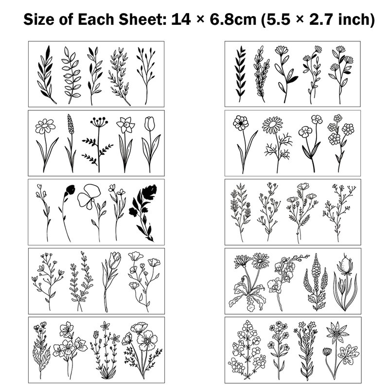 - 【Style and Elements】 10 sheets of branch flower temporary tattoos with 44 patterns including vine, branches, roses, sunflowers, tulips, florets, wildflowers and more.