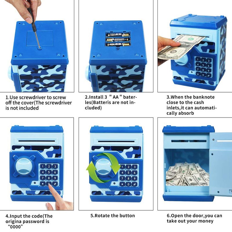 - 🛒💛【Password protection】The piggy bank has a password-protected lock.The default password is 0000 ,you can change to another 4 digits password. If you Forgot your password, Please remove the battery and reinstall it after 5 minutes. The password will be restored to "0000".