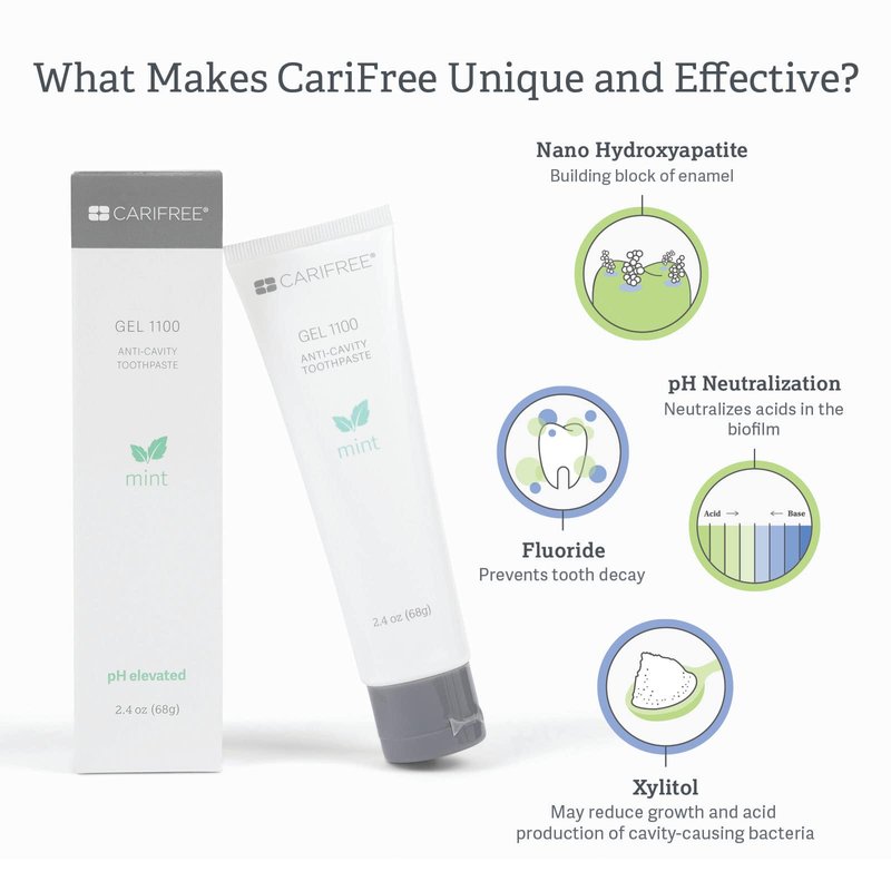 - Fight Cavities and Promote Fresh Breath: CariFree Gel 1100 contains 0.24% sodium fluoride to fight cavities and help prevent tooth decay while also freshening your breath. With patented pH+ technology, CariFree toothpaste is designed to target the root cause of cavities while also leaving your breath minty fresh.