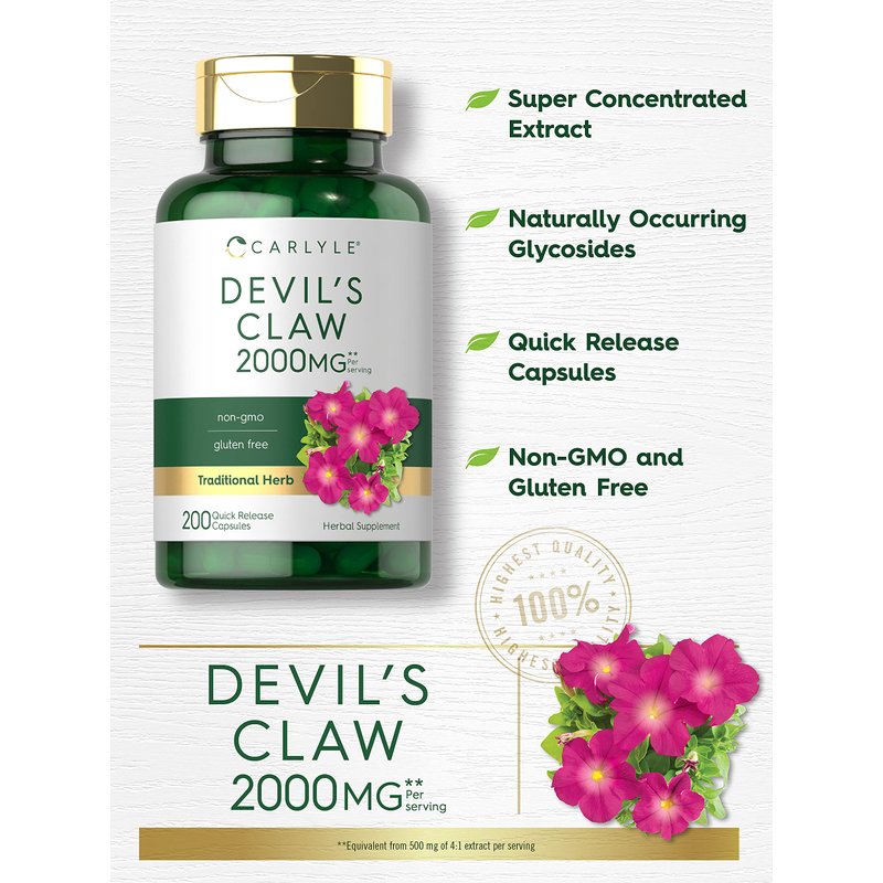Carlyle Devils Claw 2000 mg | 200 Capsules | Concentrated Root Extract | Devils Claw Herbal Supplement | Non-GMO, Gluten Free Supplement