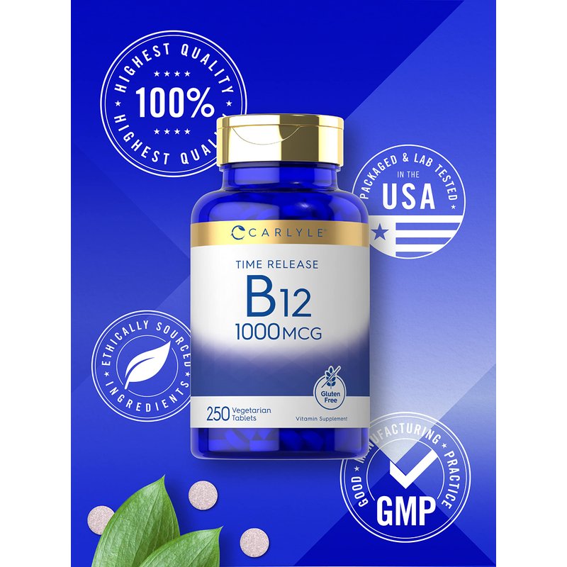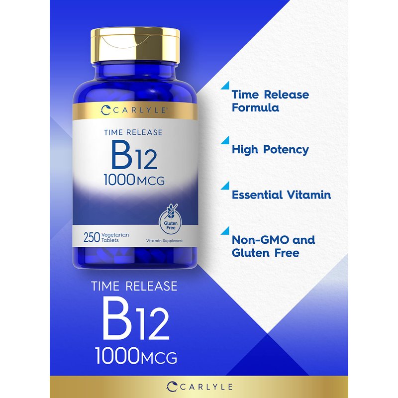 Carlyle Vitamin B12 10C00 mcg | 250 Count | Time Release Tablets | Cyanocobalamin | Vegetarian, Non-GMO, and Gluten Free Supplement
