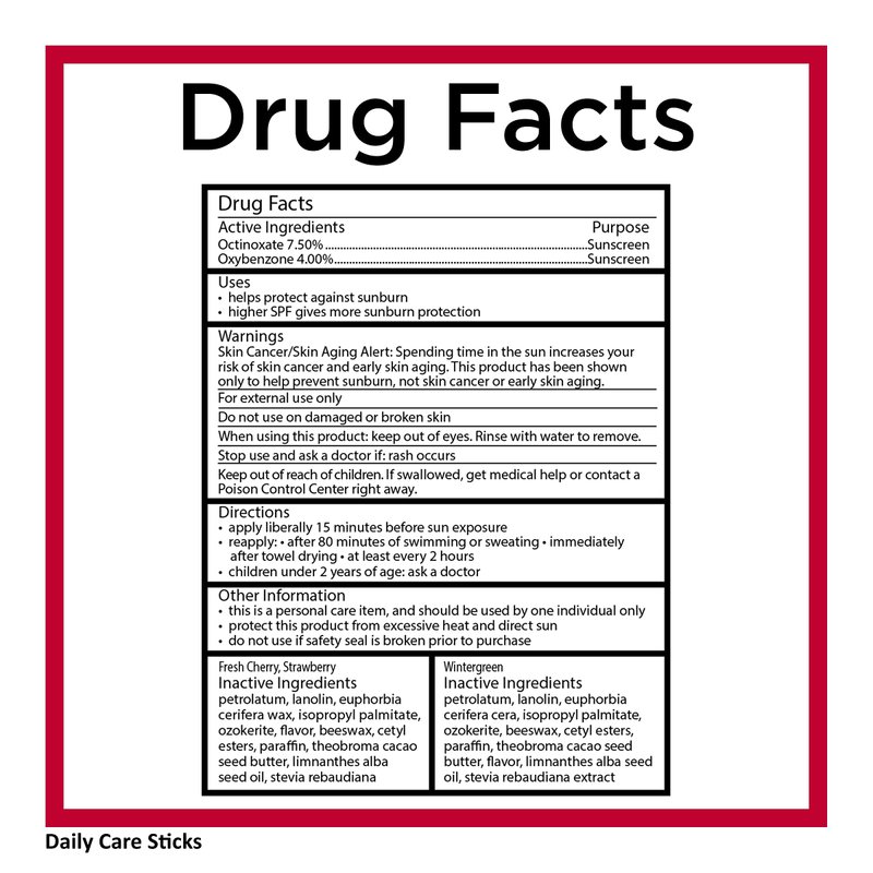 - Four 3 count packs of Carmex Daily Care Moisturizing Lip Balm With Sunscreen in Fresh Cherry, Strawberry and Wintergreen Sticks (two 3 count packs, 0.15oz each) and Tubes (two 3 count packs, 0.35oz each)