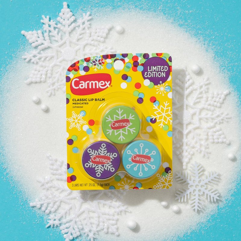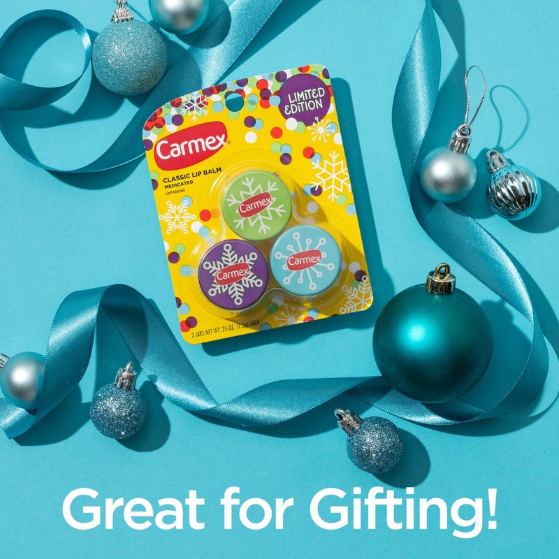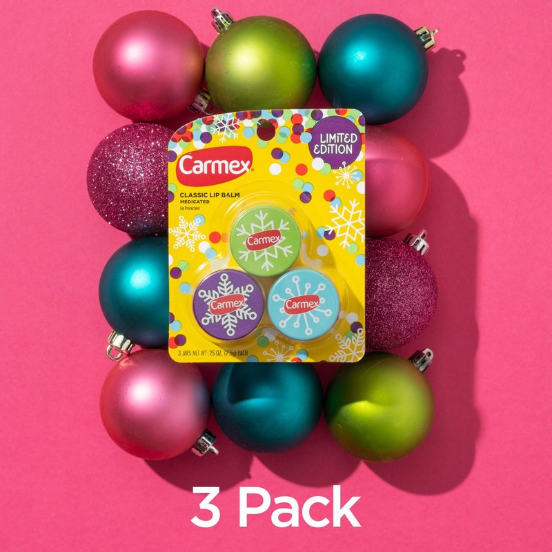 - Three 3 count packs of Carmex Medicated Lip Balm Limited Edition Holiday Jars
