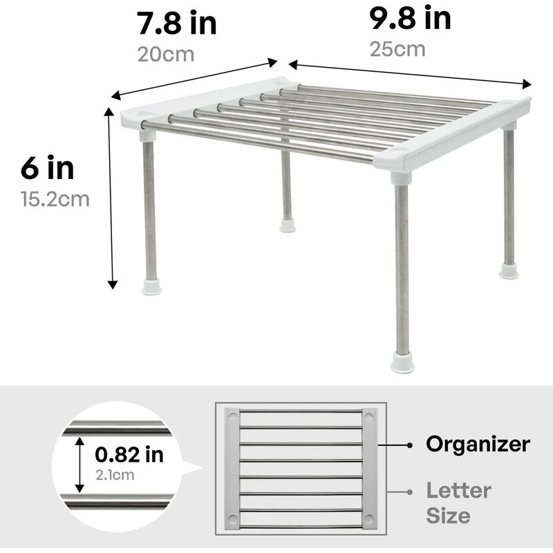 · In the Kitchen: Put them in the cabinet or on the counter to create more levels and more stacking options for boxed grains, spice bottles, glasses, bowls and more. You can never have too many storage shelves in the kitchen, right?· In the Living Room: Create a neat coffee area with these shelves - coffee mugs under and teapot above. Your coffee gear will all find a place here.· In the Office: Stack the racks together on your desk to extend your space up. Organize your cup, stapler, clips and other everyday office supplies on different levels to restore a tidy desktop.Shipping Summary: