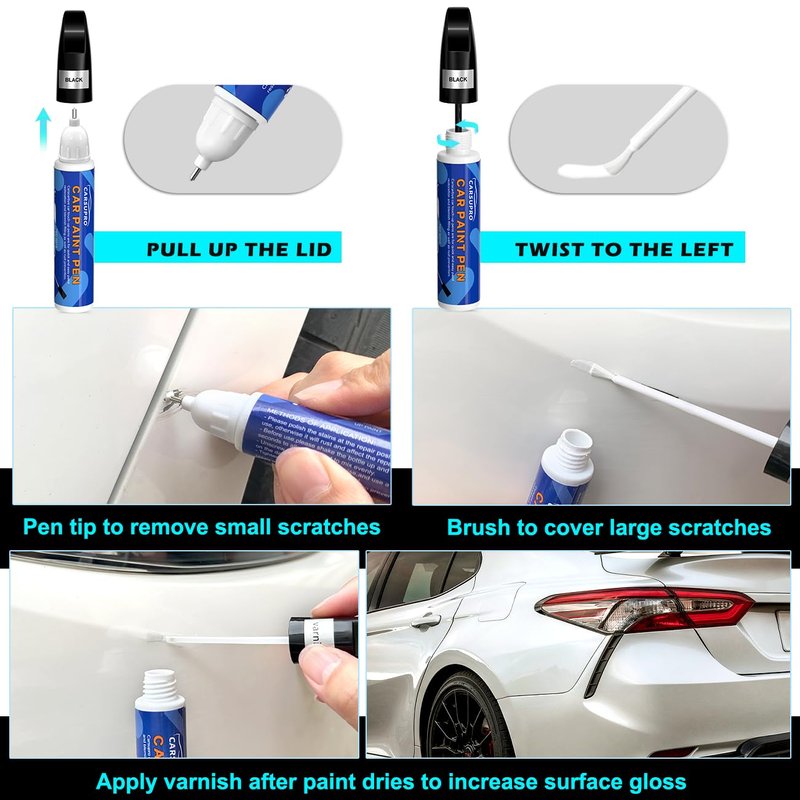 - 🤏【 EASY TO USE】First use a towel to clean the scratch area, then shake the touch up paint pen for cars up and down 5-10 times, and apply it to the scratch, If the scratches are deeper, it can be covered multiple times. After drying, apply a layer of varnish pen to make it more shiny