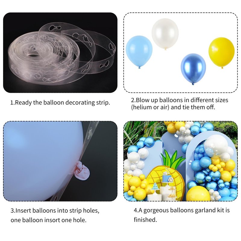 - đ ă Spongebob Party DecorationsăThe spongebob party decoration balloons arch kit includes yellow blue and white latex balloons in 5/10/18inch, 3 x 18inch Balloons (yellow*1,pearlescent white*1,blue*1) , 60 x 10inch Balloons(yellow*20,pearlescent white*10,blue*20,metal blue*10), 50 x 5inch Balloons (yellow*15,pearlescent white*10,blue*15,metal blue*10), balloons strip 1pc, adhesive tape 4pcs,ribbon 1pc.