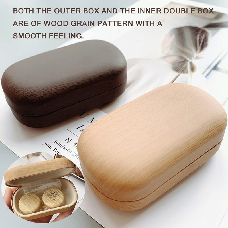 Caruncoo CARUNCOO Wood Grain Contact Lens Case Compact Eye Contact Case for Travelling Portable Contact Box with Mirror Rectangle,Cute Colorful Especially Fresh Brown 4 Piece Set