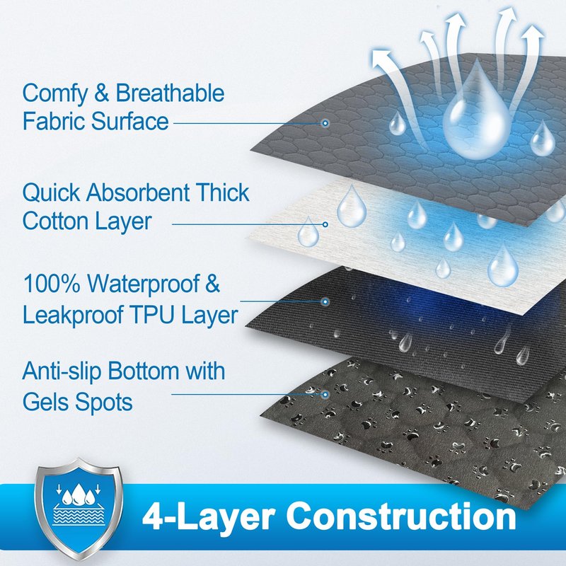 - 【SUPERIOR MATERIAL】The reusable and washable pet pee pad with 4 layers of protection. 100% polyester knitting surface for ultimate comfortable, highly absorbent polyester, waterproof inner layer and non-slip bottom.
