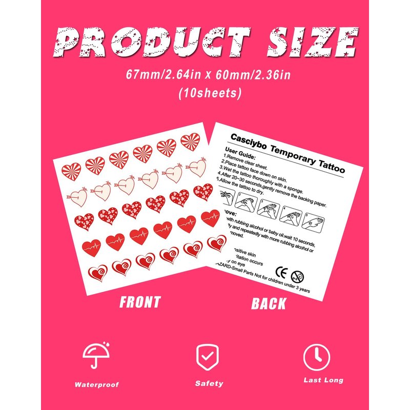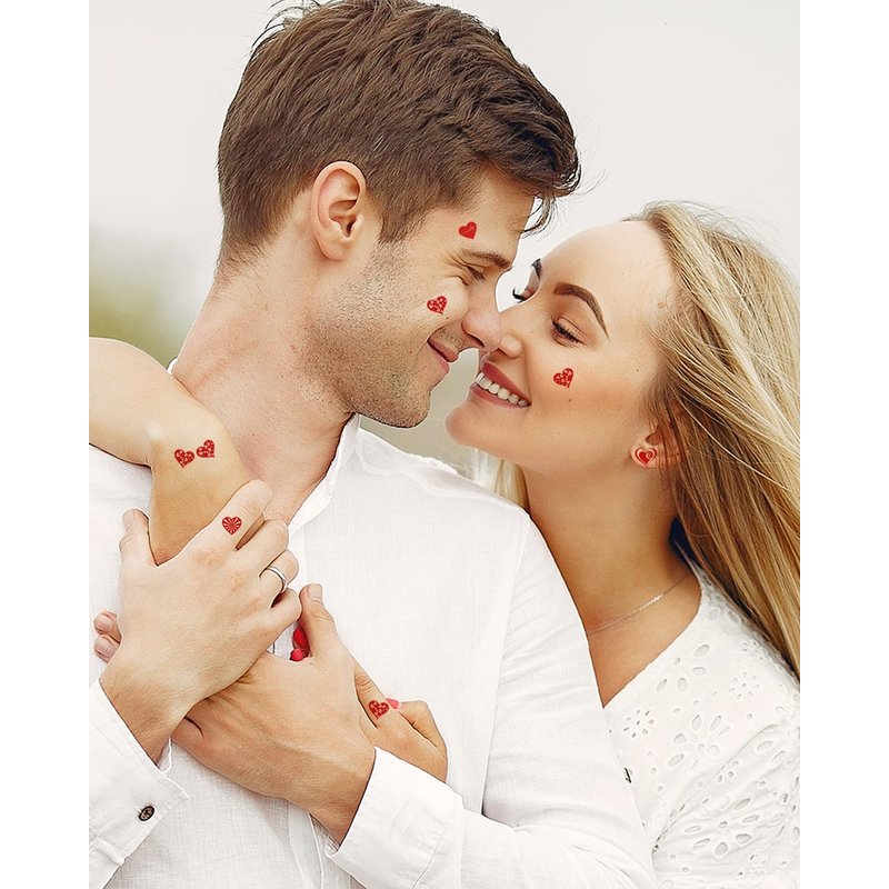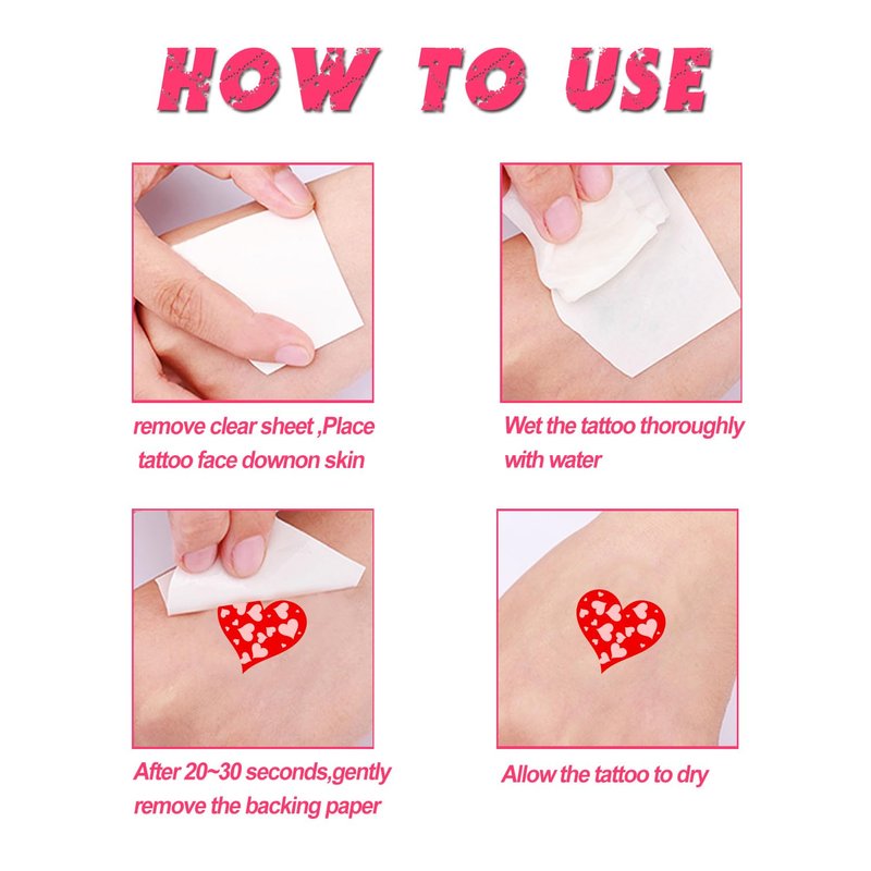 - EASY TO APPLY AND REMOVE-- Our valentine's day temporary tattoos is easy to use,Clean and dry the skin before application, cut out the desired pattern, remove the clear protective sheet, place the pattern face down on the desired area, dampen the paper with a damp towel or sponge, wait 20 seconds and remove the backing paper and you are done. Easily removed with alcohol, baby oil, olive oil, soap and make-up remover