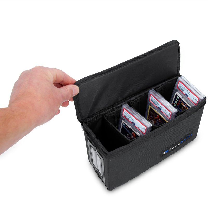 - CASEMATIX 10.5” Lightweight Graded Sports Card Case. Protective budget design prevents your valuable trading cards from being scratched. Includes three removable sports card storage dividers to separate cards. Ships flat with fold lock assembly