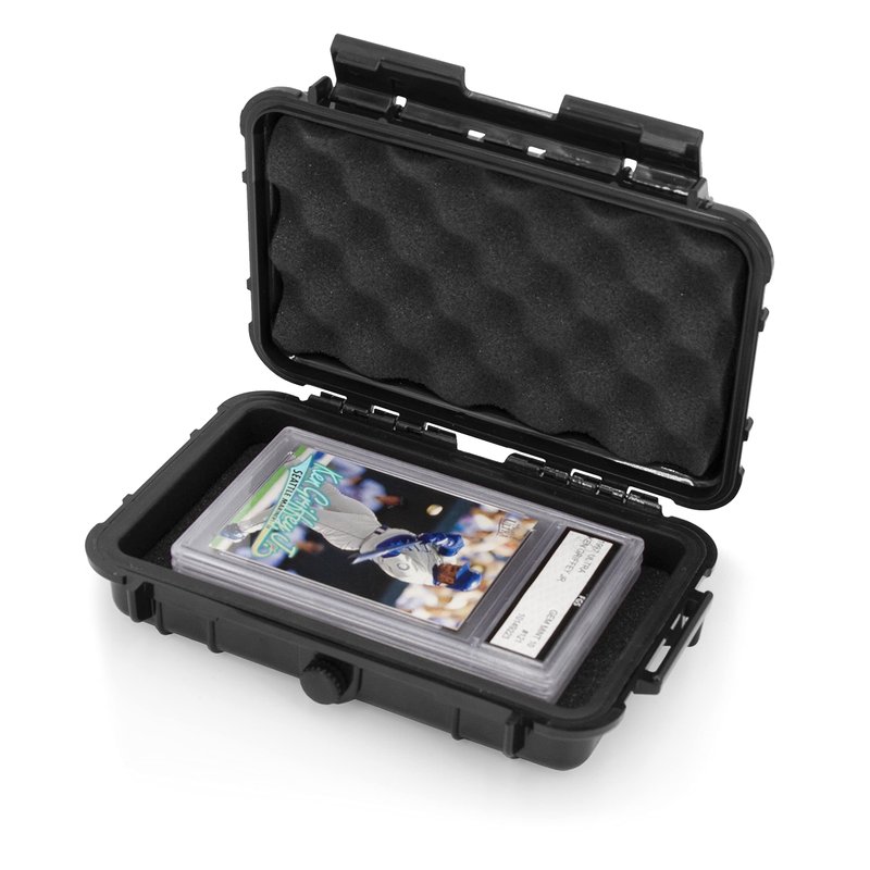 CASEMATIX graded card storage box securely holds up to 5 slabbed and graded cards. The rigid exterior protects from impacts while the padded interior protects from scratches. Foam top and bottom interior can compress to snugly hold cards in place. Case features a waterproof o-ring seal that locks out air and moisture for a truly protective card carrying case. An integrated pressure release valve allows for air release when changing altitudes.
