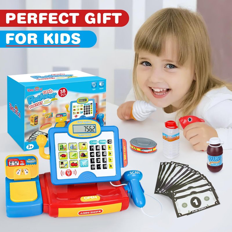 Enjoy endless fun with Dreamon's cash register! Scan a lemon and an onion, beep! "That’s $2.50, ma'am!" Cha-ching! The light-up scanner and cash drawer make realistic sounds. Your little brother and sisters will be your best customer! This toy also works as a real calculator. With fun accessories and sounds, Dreamon's cash register lets kids play shopkeeper for real, learning Toy Playset Gift for Toddler Boys Girls Ages 3 4 5 6 7+