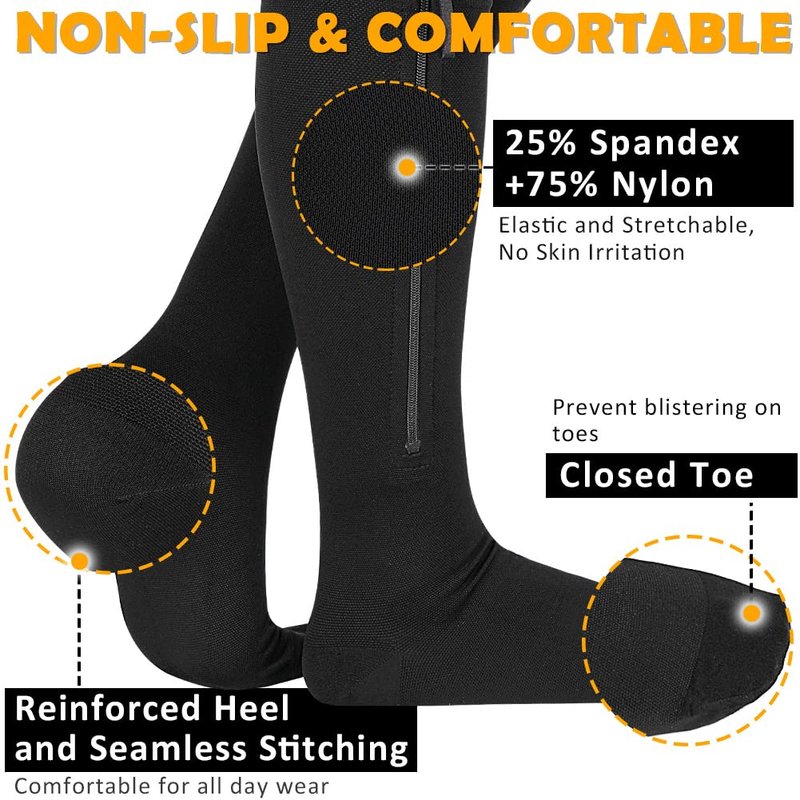 - 🔥 YKK ZIPPER & CLOSED TOE: Our zip up compression socks are easier to put on and take off than ordinary compression socks. Durable and sturdy YKK zipper stays snug fit and don't pop open. Zippered closed toe compression socks wrap the toes, reinforce the sock head flat without friction, and prevent blistering. Inner fabric under zipper protects skin from rubbing against zipper. The extended handle allows you to easily use the compression socks by yourself without any help.