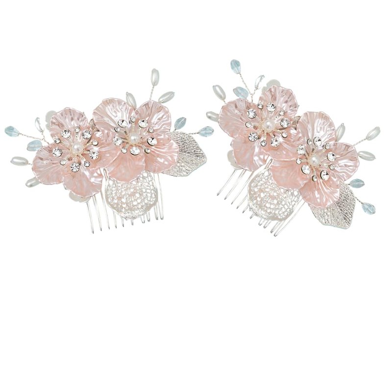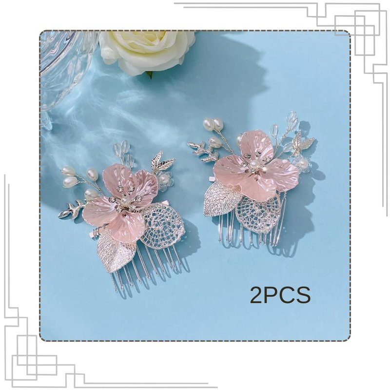 CASOLVX Bridal Small hair comb Crystal Hollow Leaf flower side comb suitable for brides bridesmaids and flower girls with wedding or Children's party 2PCS (Pink)