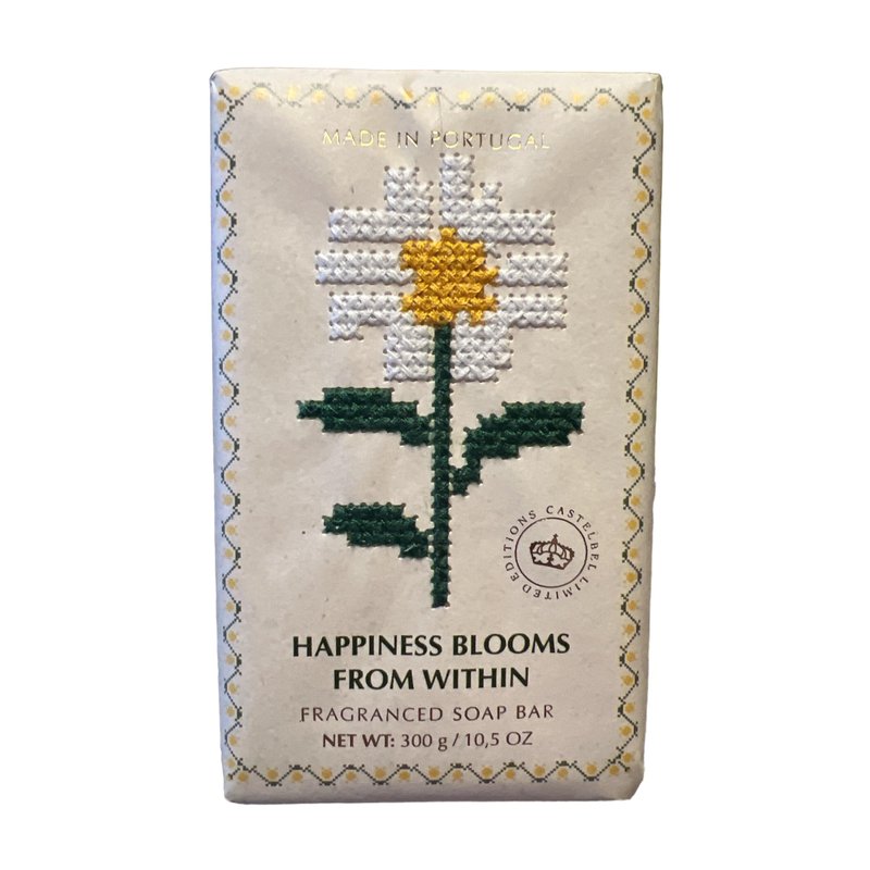 Vanilla Chamomile soap bar wrapped in decorative paper wrap with a faux daisy embroidery design.