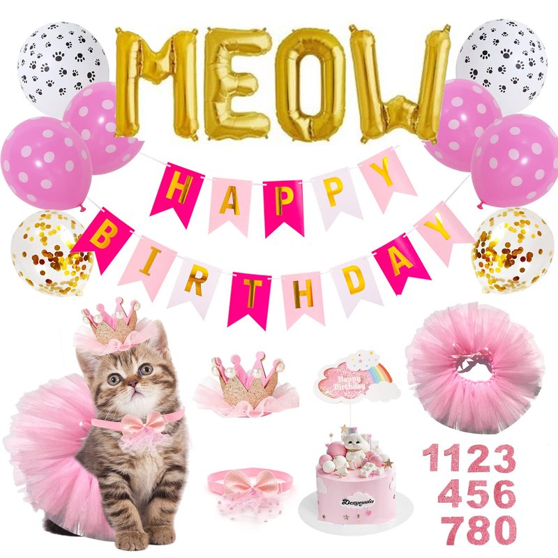 - 😼 Cat Birthday Party Decoration – A complete cat birthday party set meets your every demand,1xCat Birthday Hat,1xCat Birthday Cake Topper, 1xCat Tutu Skirt, 1xCat Bow Tie, 1xHappy Birthday Banner, 1xMeow Foil Balloon, 2xCat Paw Printed Balloons, 2xGold Confetti Balloons, 4xBlue Dot Balloons and tools to help decorating.