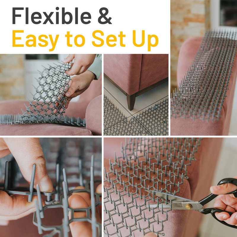 - [Easy to Use] - Our tool-free cat deterrent mat with spikes can be easily connected or cut into desired sizes for usage. Comes with 6 staples to hold the scat mat to keep cats out of potted plants.
