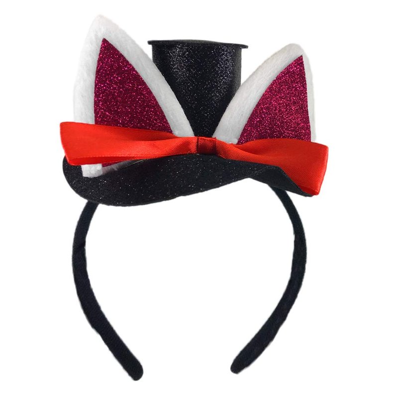 You'll be the cat's Me-ow when you wear this mini top hat with cat ears headband. Sparkly & shiny you'll surely catch everyones eye.