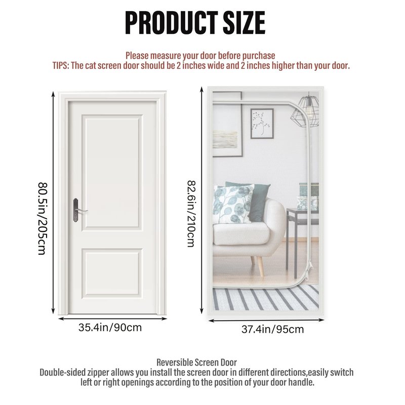 - Applicable size: cat screen door size is about 37.4" x 82.6", applicable door size is about 35"-36" wide, and length is between 80"-81" (excluding door frame size, please confirm the size in advance before purchasing Suitable).