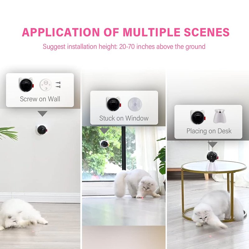 - PROVIDING THREE MOUNTING METHODS: You can directly put the lazer on the stand or use a suction cup to absorb smooth glass and also, it's available to screw on the wall, Cat toys for when they are alone, which can let them be busy. All the accessories above are in the Pet safe auto laser's package