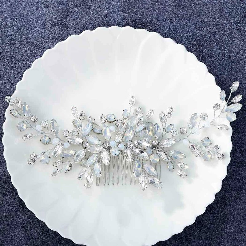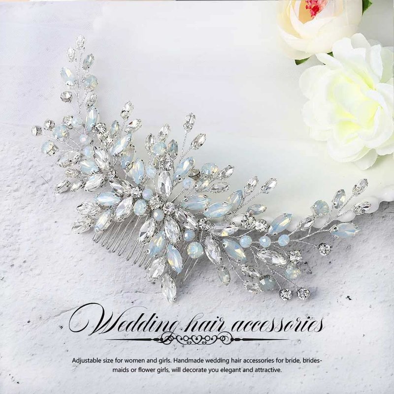 - Wedding headpieces for bride and bridesmaids are made of Rhinestones,Opal, Bead and Comb. Color: Silver, Gold .The opal looks pale blue and blue through light.