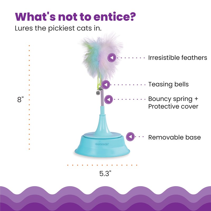 • Teasing feathers and bells entice cats to bat and swat