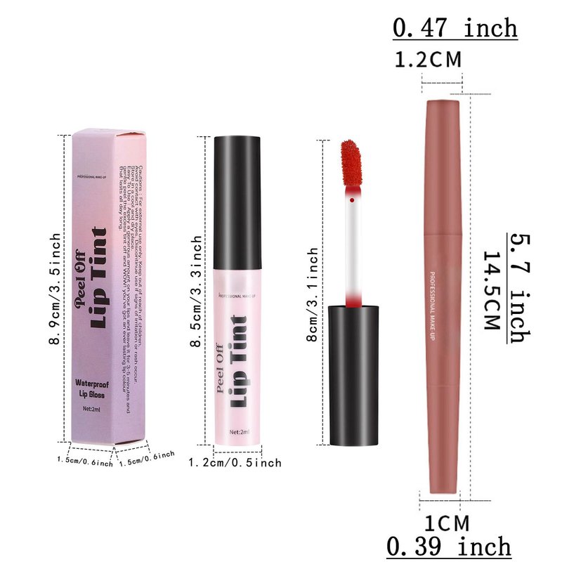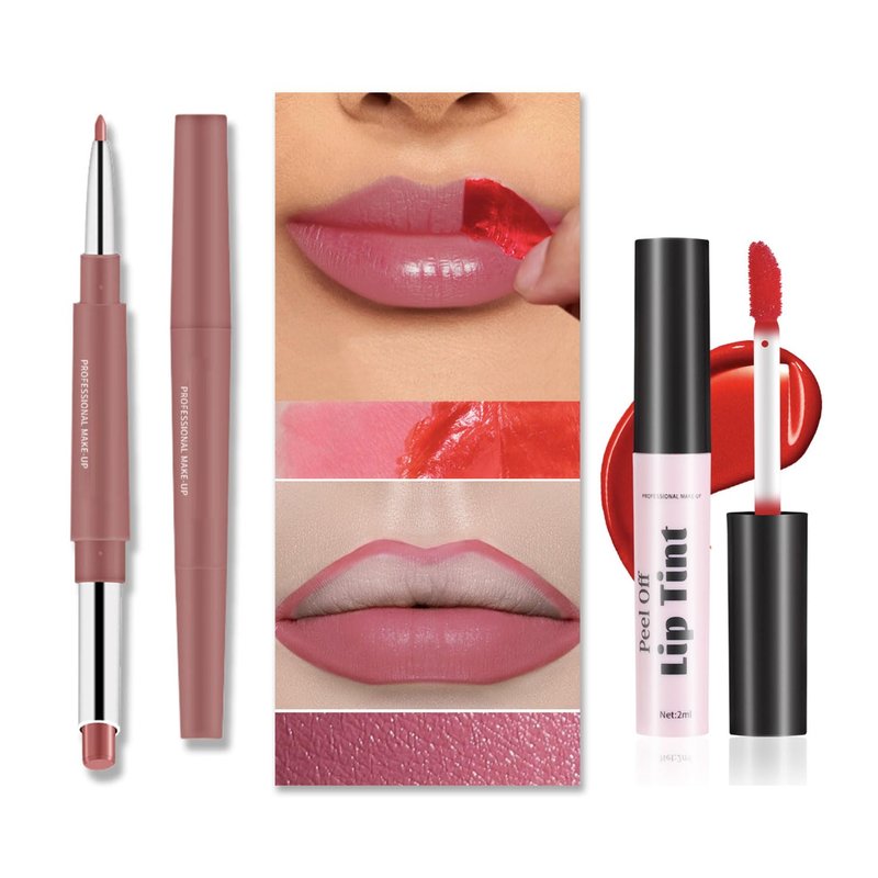This is a peel-off lip liner stain set that includes a matte liquid lipstick tattoo tint, a long-lasting waterproof lip gloss, and a touch-up pen. The set is perfect for those who want to achieve a bold and long-lasting lip look.
