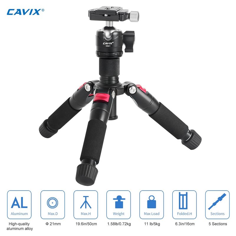 CAVIX K521 Portable Desktop Tripod for Desk Table Aluminum Alloy 20"/ 50cm with 360° Panoramic Ball Head, 1/4”Mini Shoes Quick Release Plate &3/8" Converter Screw for DSLR Camera Video Camcorder Compact Tripod Description: ●The tabletop tripod is made of aluminum alloy, durable &solid ●With the use of a tripod, it can achieve greater performance and maintain image quality for cropping larger picture sizes ●The small tripod desk is the best choice for macro shooting with smaller size, lighter weight and closer distance ●Adjustable height 6.7-19.7 inches/ 17-50 centimeters, 5 sections leg tubes ●Supplied a 360 degree swivel tripod ball head with bubble level provides you with a panoramic photography ●Non-slip feet design to keep the portable tripod steady. Max load weight is 11 lbs/ 5kg for optimal performance ●Compatible with Nikon, Canon,Pentax, Panasonic, Sony, Samsung, Olympus and more digital mirrorless DSLR cameras, Video Camcorders ●User-friendly design, sponge sleeve on tripod leg makes the grip more comfortable. ●The mini table tripod has 3 adjustable leg angles: 21°, 50°, 88° , supports low angle shooting and marco shooting, suitable for record sports, flowers, nature ●It supports not only cameras, but also iPhone and Android phones, Gopro, fill light, magic arm, etc. Features: ●Item #: K521 ●Material: Aluminum Alloy ●Color: Black+Red ●Tripod Ball Head Diameter: 1.1"/28mm ●Load Capacity: 11 lbs/ 5 kilograms ●Max/Min Height: 19.7"/ 50cm; 6.7"/ 17cm ●Folded Length: 6.3"/ 16cm ●Standard Screw: 1/4 inch ●Net Weight: 1.5lb /700gram ●Max/Min Tube Diameter: 21/9mm Package Contents: ●1x Aluminum Alloy Tripod ●1x 360° Panoramic Ball head ●1x Quick Release Mounting Plate ●1x Quick Release Clamp NOTE:The Camera is Not included.