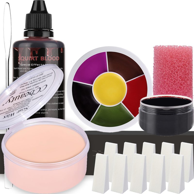 - 8pcs HALLOWEEN MAKEUP KIT - 6-color Bruise Wheel + Dark Scar Wax + Metal Spatula Tool + Stage Blood + Coagulated blood, 2 Pink Stipple Sponge + 10pcs White Triangle Sponges, all in one set for Halloween SFX Special Effects Makeup