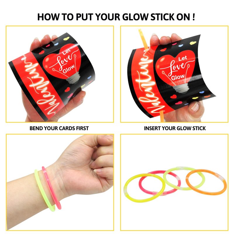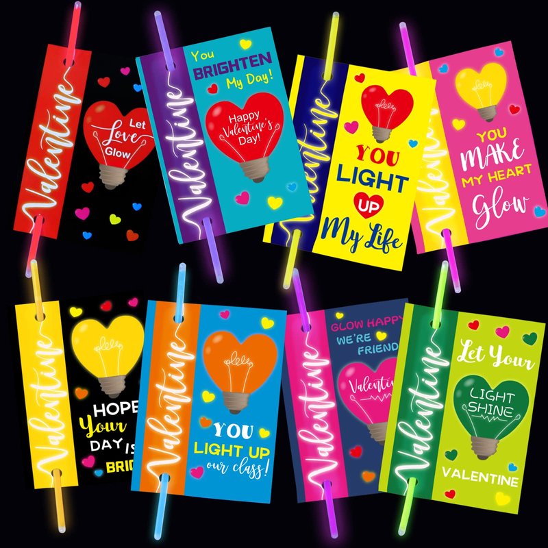 • What You Get: 32 cute Valentines cards, 32 glow sticks. Each card size is 5.5 x 3.9 inches. 8 designs, 4pcs per design