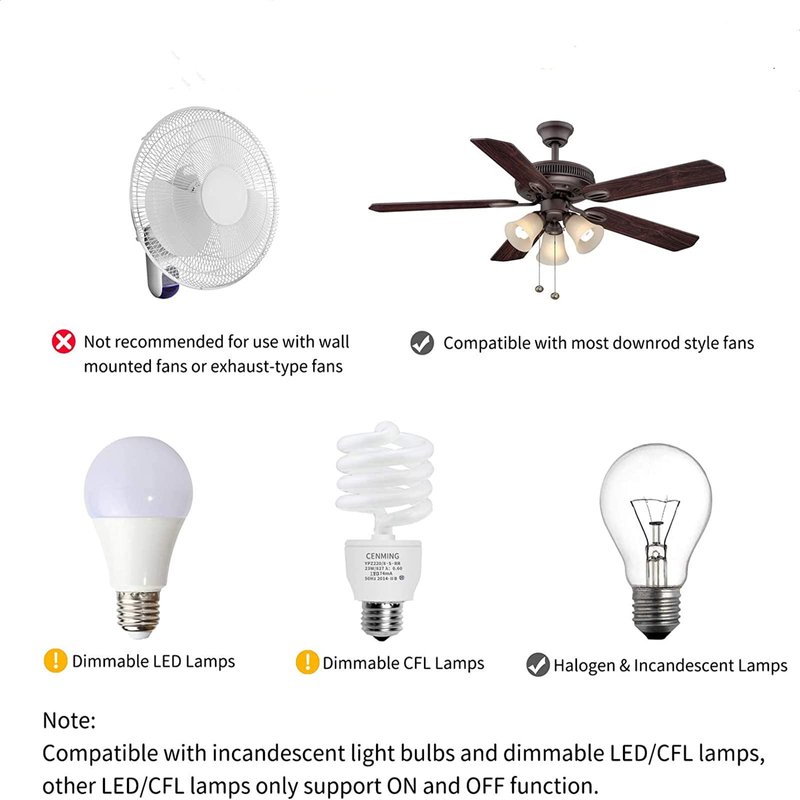 - Fan button controls 3-speeds (high/medium/low).Please note that the receiver does not have the function of Reverse.Light dimmer button just controls the brightness of the incandescent lights,if your light is LED, only control the LED’ on/off.Most LED lights and all CFL lights are Not dimmable, light dimmer only supports the ON/OFF function in that case, and it may cause to flicker when using the dimming function.