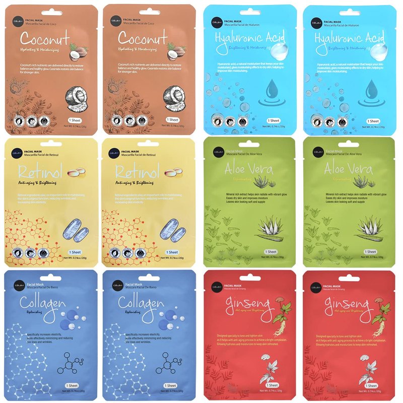 - 12 Pack Includes - Coconut (2), Hyaluronic Acid (2), Retinol (2), Aloe Vera (2), Collagen (2), Ginseng (2)