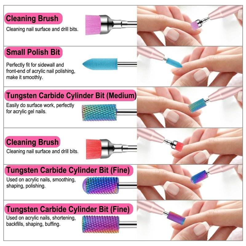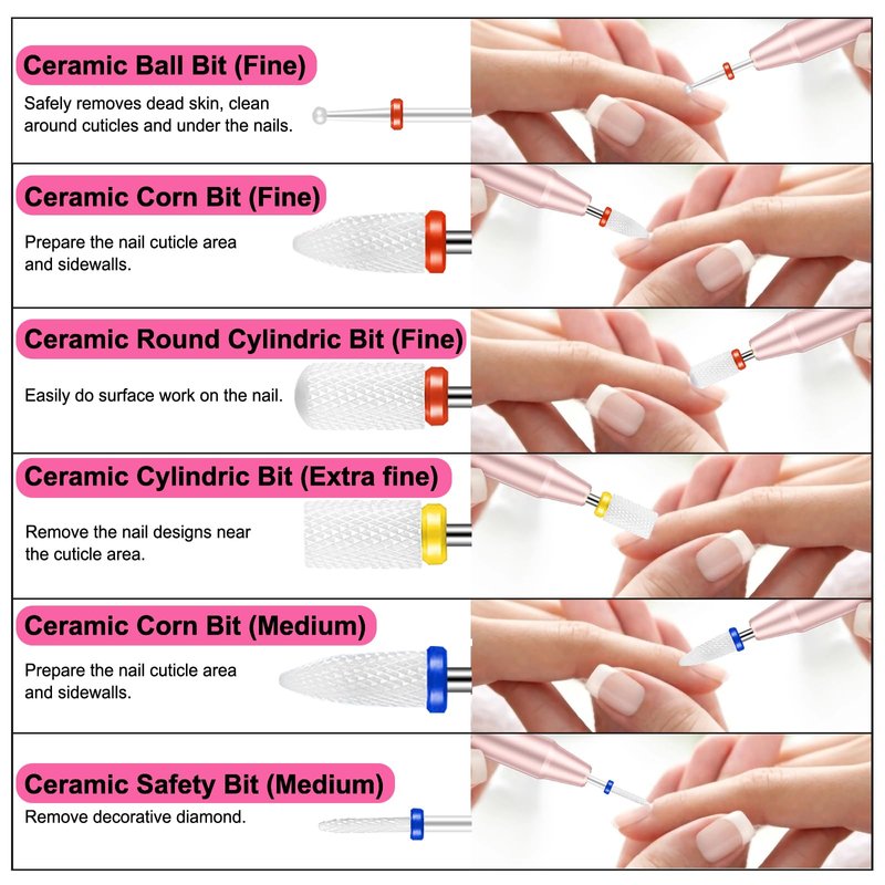 - Great Quality and Saving Money: These nail bits for nail drill are made of premium material. This acrylic nail drill bits kit includes 13 diamond carbide, 6 ceramic, 3 tungsten carbide nail bits, 1 rubber polishing nail bit and 2 cleaning brushes, made to last and save money for you.