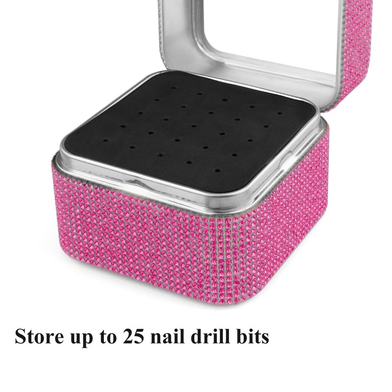 - 【Quality Material】-- Made of the high quality Aluminum & Rhinestone, which is safe, environmental and durable. This nail drill bit holder holds up to 25 bits and clear top design makes it easy to find your nail drill bits.