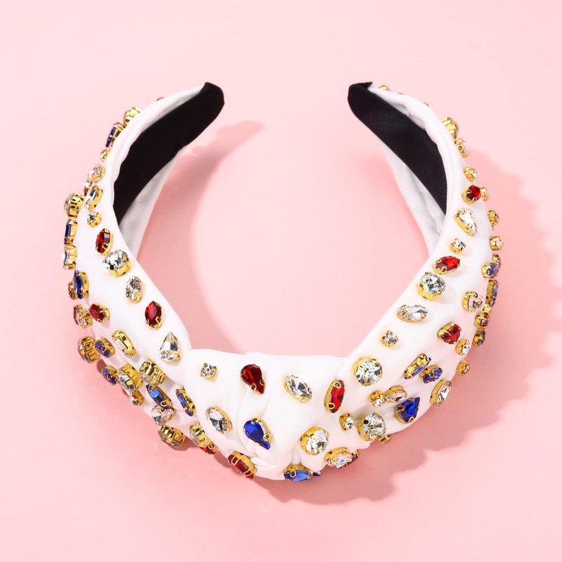 CENAPOG Rhinestone Knotted Headband for Women Sparkly Crystal Embellished Hairbands Twist Turban Headband Elastic Wide Velvet Hair Hoop Party Wedding Headwear for Girls (American Flag Colors)