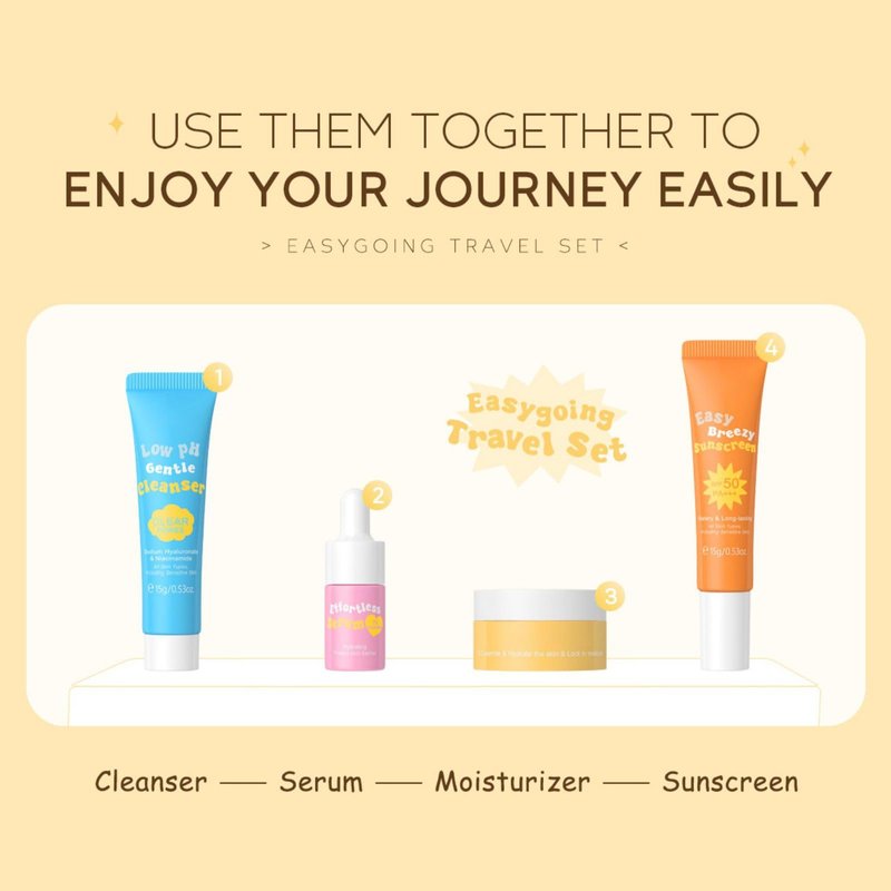 - 4-PIECE ESSENTIAL TRAVEL SIZE SKIN CARE SET - The Skin care travel kit has your favorite skincare products, suitable for both travel and holiday travel to protect your delicate skin! Cleanser, serum, face cream and outdoor essential SPF 50 sunscreen can keep skin clean, balanced and super moisturized when traveling.