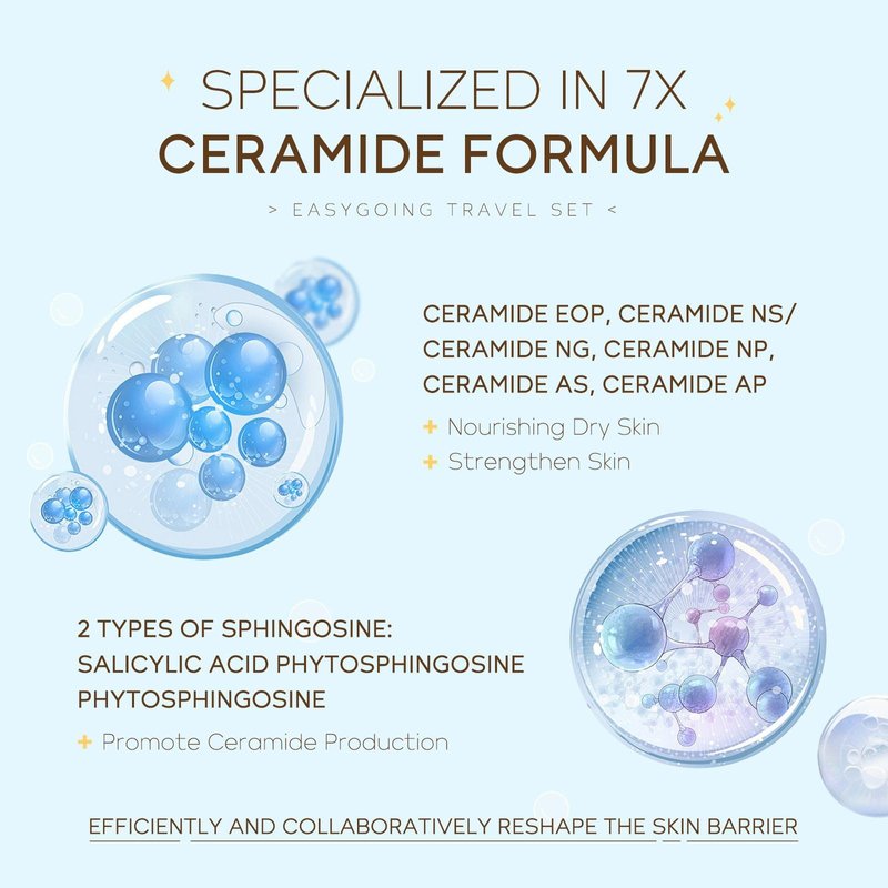 - CLEANSES & NOURISHES SKIN - This travel skin care set contains facial cleanser, low PH, and mild foam to help reduce excess oil and clean pores. Ceramide face serum and face moisturizer help the skin to establish a water barrier and promote 24-hour hydration. SPF 50 sunscreen for face and body is lightweight, non greasy, waterproof.