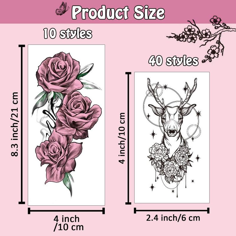 Package Included: 50 sheets tattoos in a set.10 sheets:8.27″*3.94″(21*10cm), 40sheets:4.13″*2.36″(10.5*6cm)