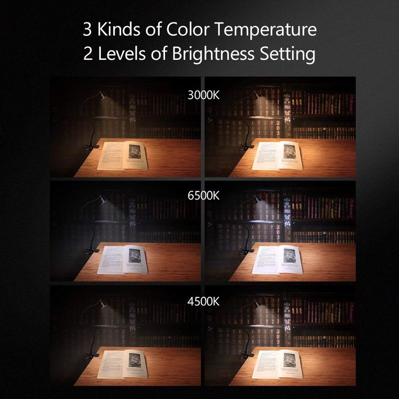 - MOST COMFORTABLE LIGHTING SOURCES: 3 Kinds of Color Temperature, warm light (3000K), warm–white light (4500K) and white light (6500K), each CT has 2 levels of brightness, so that it create 6 illumination modes, meet all your requirements. Clip on bedside or headboard and reading in bed, comfortable light brings you comfortable life!