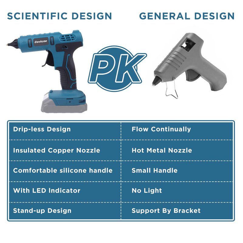 - 【ANTI-DRIP NOZZLE & ANTI-SCALD】Cevhzoe cordless hot glue gun for crafts features a custom-designed precision nozzle with a rubber protector to prevent scalds and leakage of glue. This ensures your maximum safety and keeps your working area free of glue webs or any other mess.